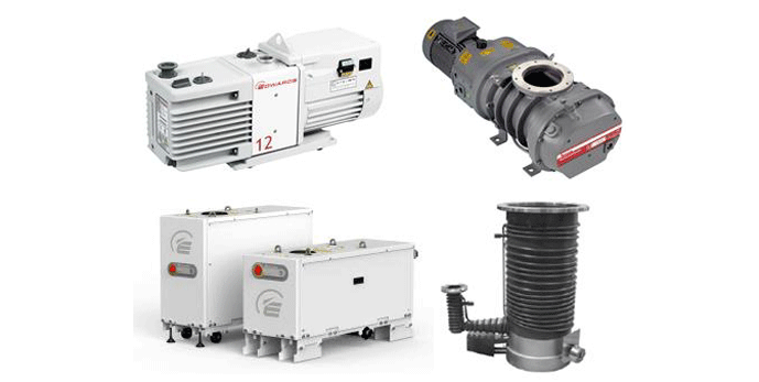 Typical vacuum pumps found in a heat treat shop, top left to lower right: rotary vane oil pump, roots blower, dry screw pump, and diffusion pump (courtesy of Edwards Vacuum)