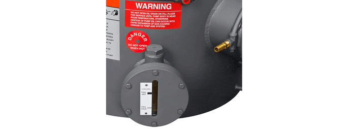 Check the oil level frequently. It is typically viewed through a site glass on the pump (Fig. 2). If lighting is poor, it is recommended to use a flashlight to observe the oil level as it can be difficult to see. There are sometimes different fill lines for the pump depending on whether it is cold or hot.