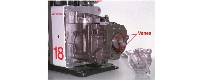 Vacuum pumps should be dismantled and inspected after every 3000 hours of operation. For oil sealed rotary pumps, the vanes (Fig. 4) should be inspected for cracks or excessive wear and replaced if necessary. When replacement is necessary, they should always be replaced as a set. Diffusion pumps (Fig. 5) should be checked for contamination of the nozzles and buildup of deposits on the interior surfaces (Fig. 6). After inspection the interior must be thoroughly cleaned because even fingerprints outgas and can cause contamination of the process. Common industry practice for cleaning diffusion pumps is to use acetone and then an isopropyl alcohol rinse to clean internal pump components (e.g., pump body, jet assembly). Dry screw pumps, claw pumps, and roots blowers should have the screws or rotors inspected for wear and excessive clearance between the rotors. When the rotors need to be replaced, they must be replaced in pairs. If your in-house maintenance personnel do not have the expertise or the time to perform the internal inspection, it can be outsourced to the pump manufacturer or a third party service provider.